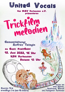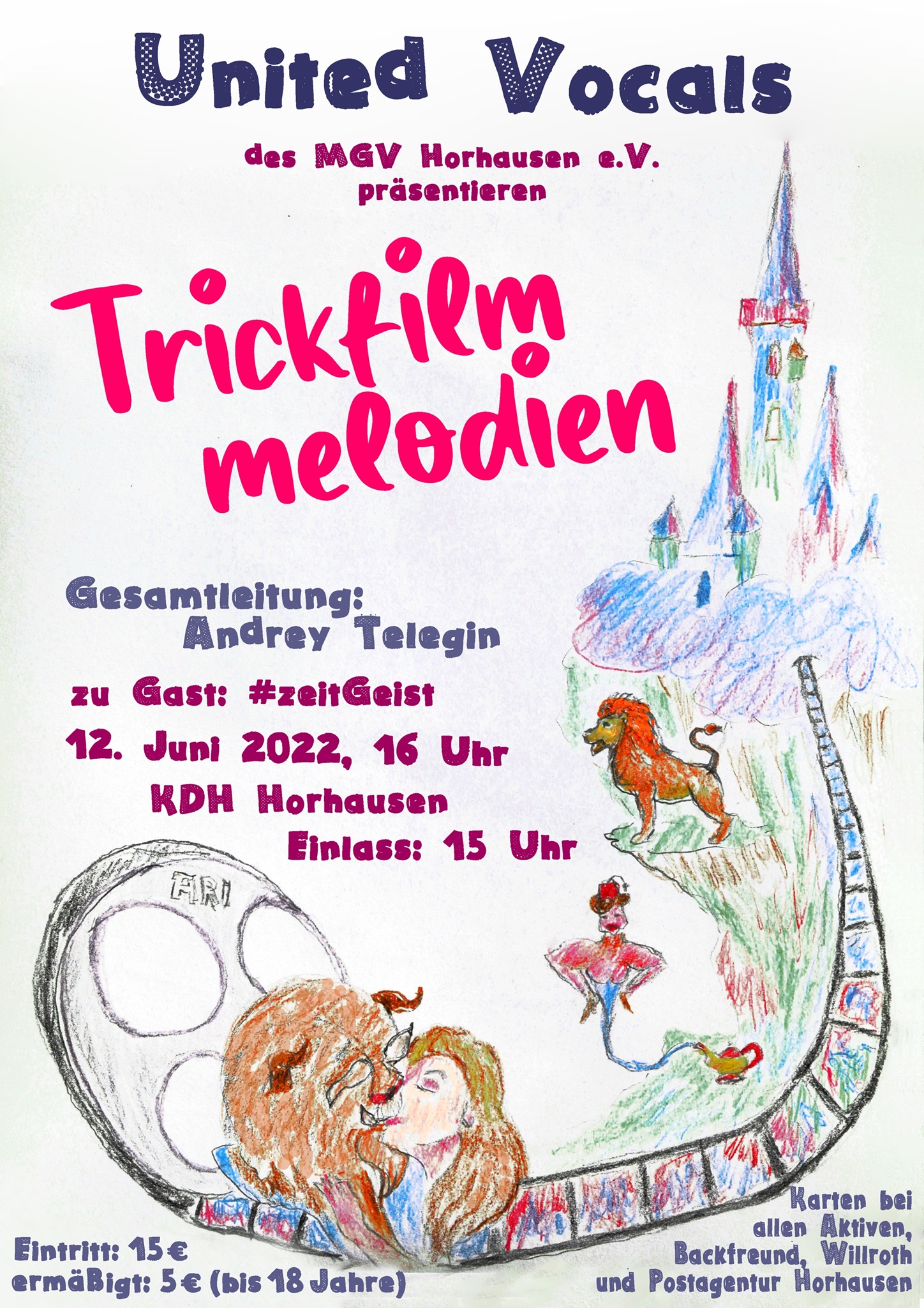 Musikalische Trickfilmerinnerungen mit ausschließlich Melodien aus bekannten Zeichentrickfilmen, die sicherlich Jung und Alt mitsingen können. Schließlich sind die Älteren mit Mary Poppins, dem Dschungelbuch oder Schneewittchen aufgewachsen, während die Jüngeren die Lieder der Eiskönigin oder Vaiana auswendig kennen. Dieses Konzert ist also insofern ein Novum, als sich der MGV dieses Mal streng am Konzerttitel orientiert, denn wo „Trickfilmmelodien“ draufstehen, sind auch nur die drin. Die Auswahl richtet sich damit ganz besonders an die jungen Besucher, die auch bestimmt Spaß an Popcorn, Eis und bunten Kinoplakaten haben. Pappaufsteller und Plakate können übrigens nach dem Konzert fürs Kinderzimmer erworben werden. Und was wäre ein Konzert ohne besondere Gäste? Die UVs haben sich neben Elsa, der Eiskönigin und Woddy aus „Toy story“ ein paar tolle Mitsänger eingeladen: Der Chor „#zeitgeist“ aus Dierdorf singt einige Lieder mit wie z. B. Stücke aus dem „König der Löwen“. Die United Vocals freuen sich endlich wieder zeigen zu dürfen, was eigentlich schon für 2020 geplant, aber wegen Corona komplett ausgebremst worden war. Wer wie der MGV seit Monaten gierig nach Musik ist, kann Konzertkarten für 5 bzw. 15 € bei der Postagentur Horhausen, dem Backfreund in Willroth und wie immer bei den Aktiven erwerben.